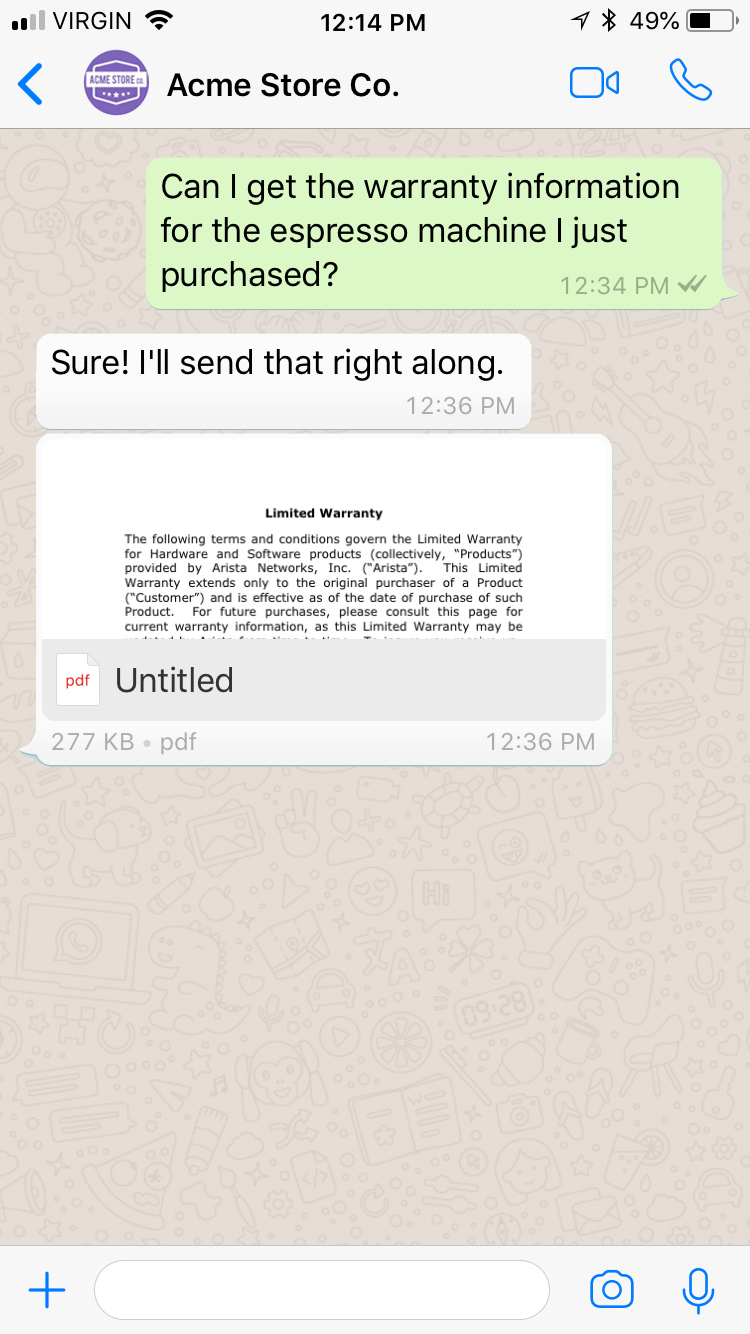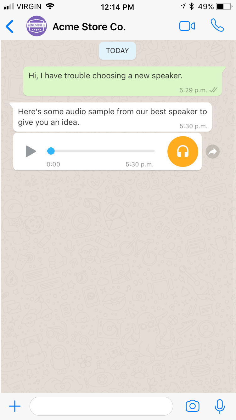 Audio messages are rendered with an audio player and display the caption in a separate text message. When a file is larger than 5MB or has an extension not included in the following list: .aac, .mp4, .amr, .mp3, .opus, and .ogg it will be sent as a link; otherwise it will be rendered natively in the conversation. Moreover, if an error is detected when sending an audio message, the message will instead be delivered as a text message containing a link.