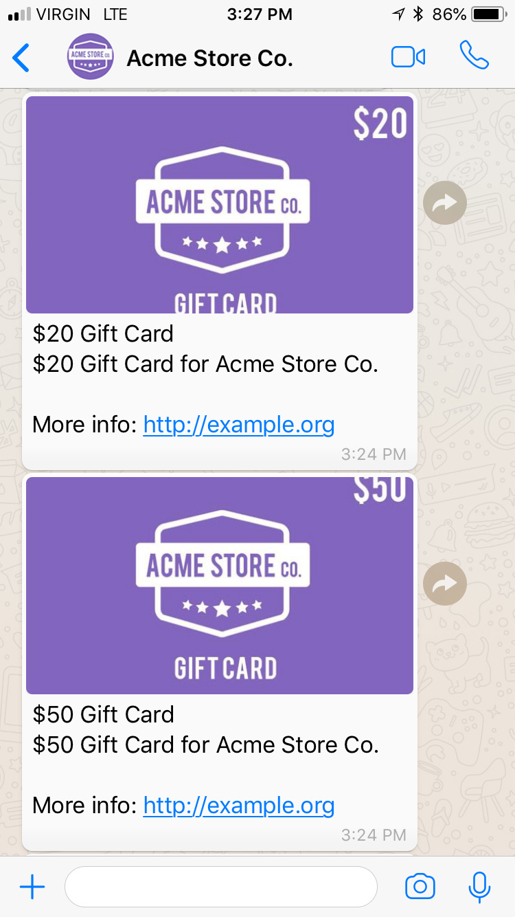 WhatsApp provides their own templated message mechanism. WhatsApp Message Templates are plain text messages that are individually approved by the WhatsApp team to ensure they do not violate the WhatsApp policies. Businesses must use message templates when first reaching out to users or when sending a message 24h after the last message from the user. This type of message is paid.