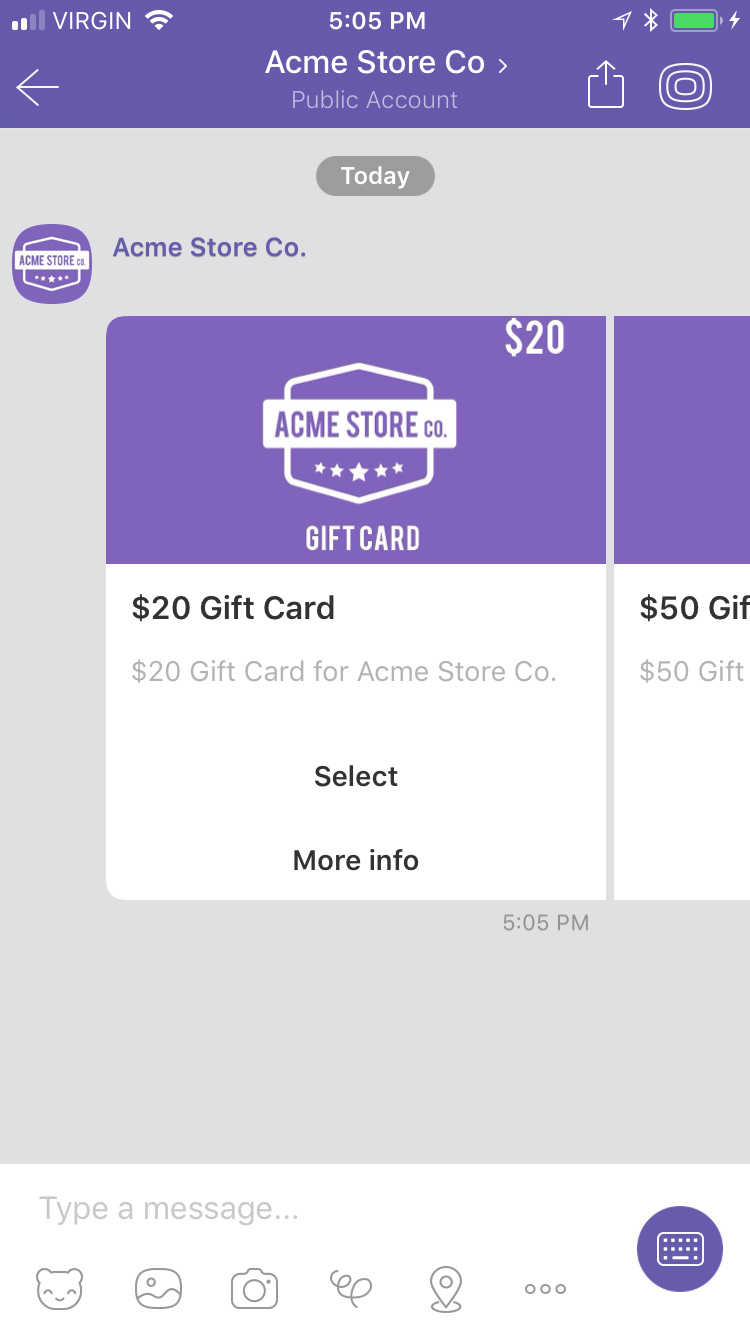 Viber offers full support for carousels which allows you to send a set of horizontally scrollable items that combines text, image and message actions.